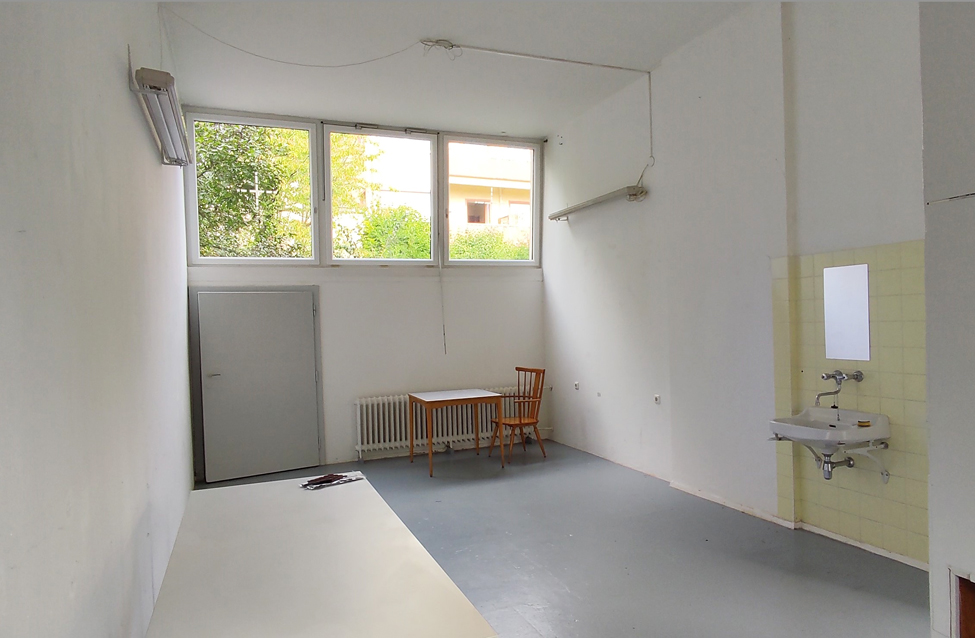 Rauminfos: Atelier im EG mit Gartenzugang, Größe ca. 30 m², Raumhöhe ca. 3,20 m, Waschbecken, Schrank, Fenster nordseitig ausgerichtet, kein Starkstrom, kein Lagerraum, keine Wohnmöglichkeit, monatliche Kosten 140 €.